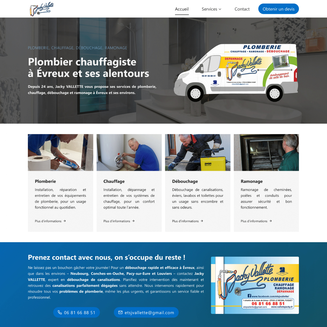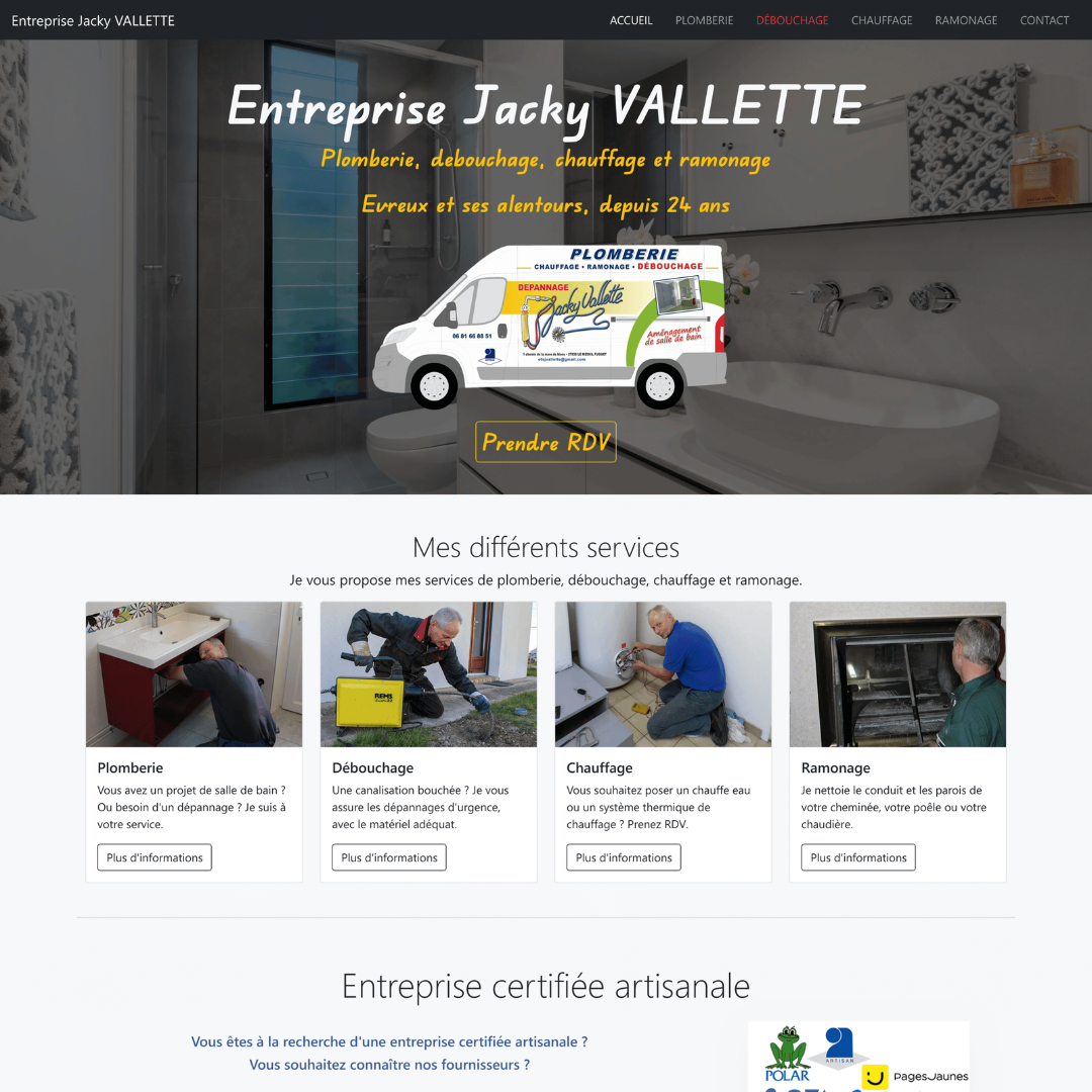 Artisan plombier, Monsieur Vallette Jacky souhaitait disposer d’un site vitrine professionnel afin de renforcer la visibilité de son entreprise sur Internet. L’objectif était de valoriser son savoir-faire, d’améliorer son image de marque et de toucher une nouvelle clientèle.