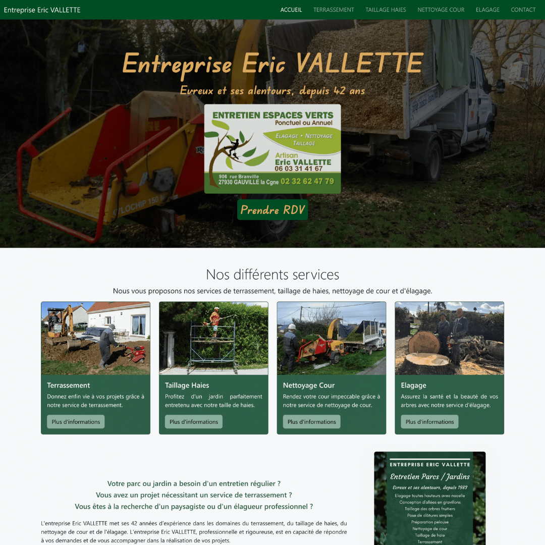 Paysagiste indépendant, Monsieur Vallette Eric souhaitait développer sa visibilité en ligne afin de présenter ses réalisations et mettre en avant son expertise auprès d’une clientèle locale.