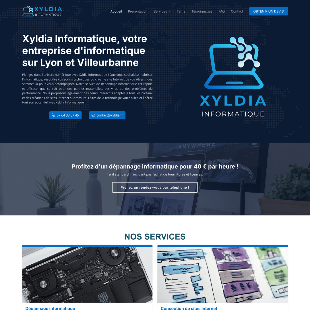 Auto-entrepreneur depuis mai 2024, j’ai réalisé un site Internet pour ma micro-entreprise (un autre que celui que vous êtes actuellement en train de parcourir) mettant en avant mes services de dépannage et de réparation informatique dans la région lyonnaise.